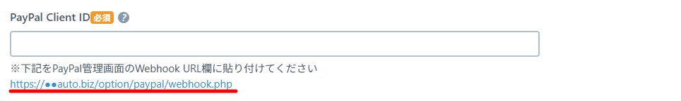 「PayPal Client ID」の下にWebhook URLが表示されています。