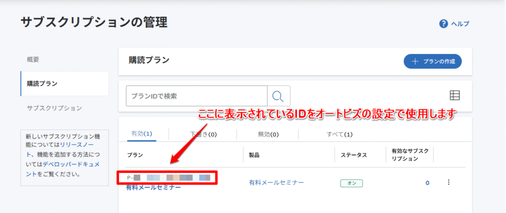 作成した購読プラン名の上に表示されている、Pから始まるIDをオートビズの決済連携の設定で使用します。