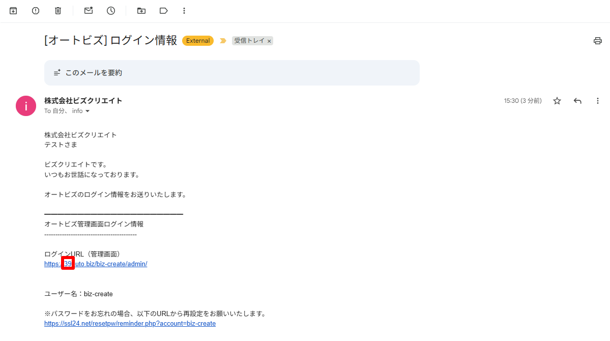 送られた自動返信メールにオートビズ管理画面のURLが記載されていますのでサーバー番号が確認できます。