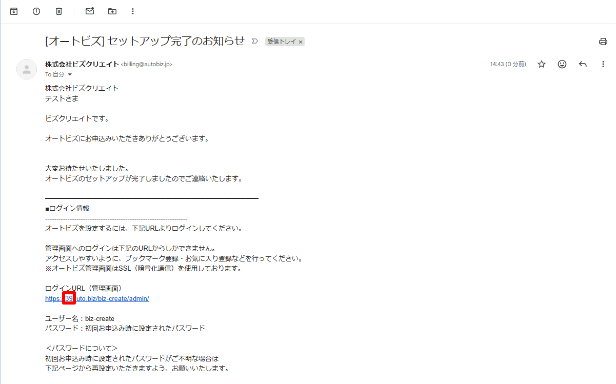 | 件名 | オートビズセットアップ完了のお知らせ |