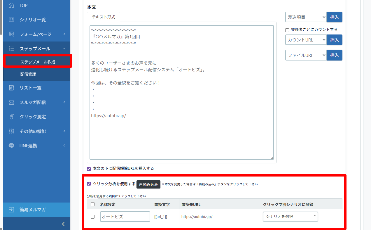 ステップメール、メルマガのメール作成画面で設定できます。