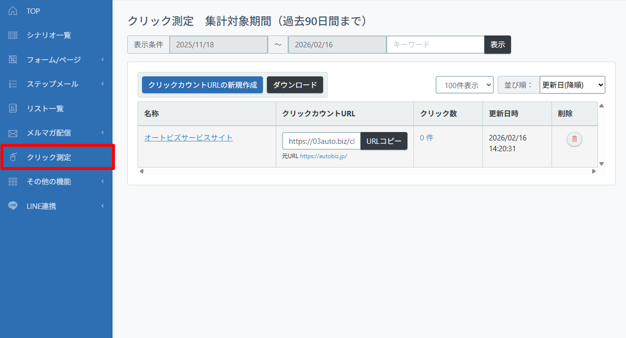 URLが読者に何回クリックされたか、【クリック測定】ページで確認できます。