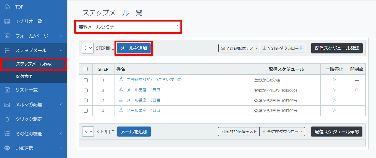 ]をクリックして、必要通数分のステップを追加してください。ステップの途中にメールを追加したい場合は、何STEP目に追加するか指定してください。
