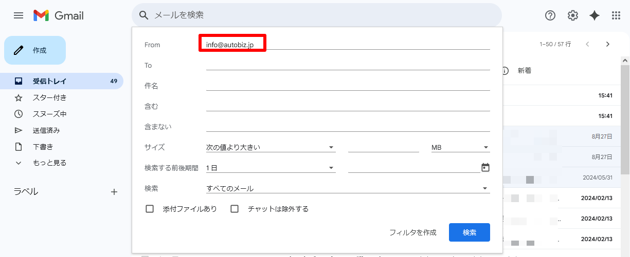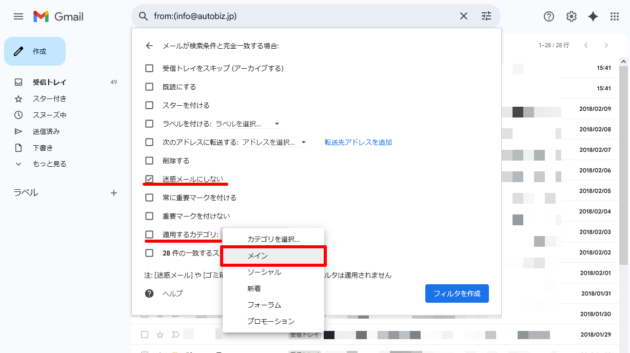 以下にて、Gmailでのフィルタ作成の手順をご案内いたしますのでご参考にしてください。
