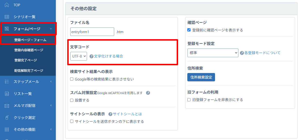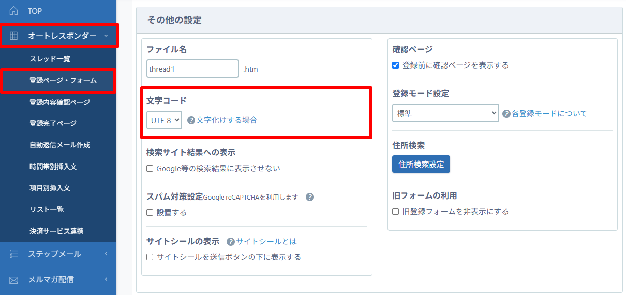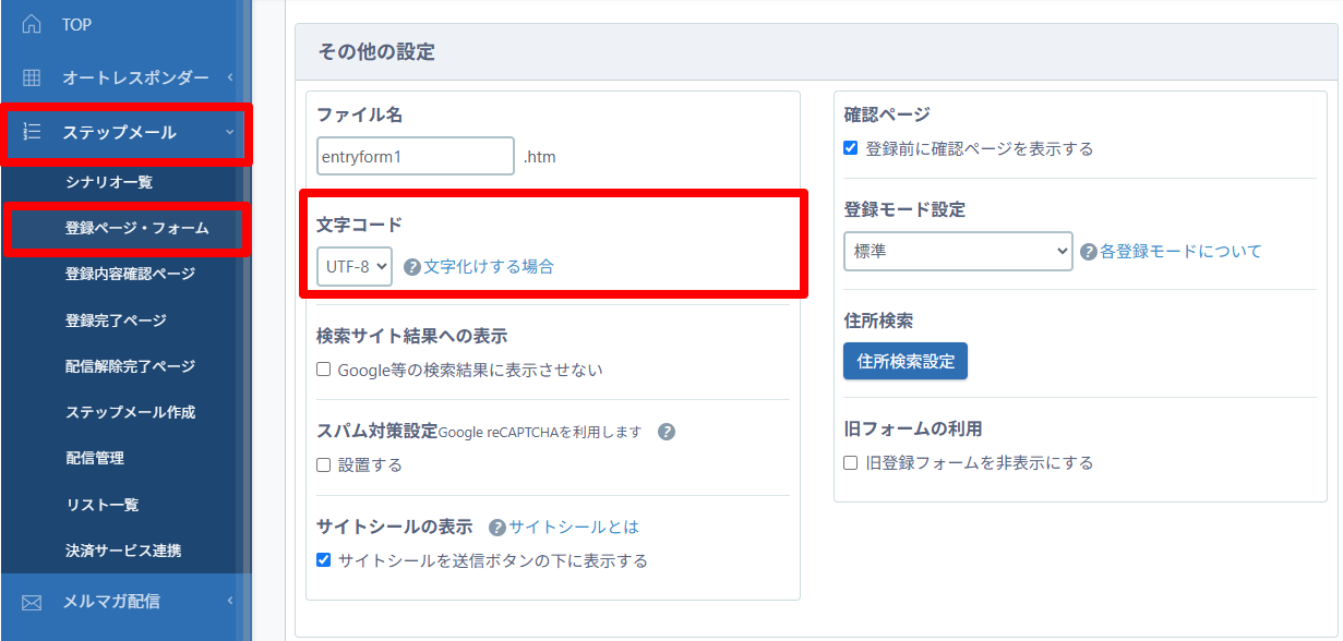 文字コードを指定する登録ページの文字コードを「SJIS(Shift-JIS)」「EUC」「UTF-8」に指定できます。※デフォルトは「UTF-8」が設定されています。自作ページ(サイト)等にフォームを設置する 場合などは、そのページの文字コードに合わせて設定してください。参考:フォームから登録された内容が文字化けしてしまいます。設定手順1. 【登録ページ・フォーム】> 「その他の設定」欄の「文字コード」を確認 スーパーライト・ライト・スタンダードプロ(オートレスポンダー)プロ(ステップメール) 2. 「文字コード」を変更3. をクリック