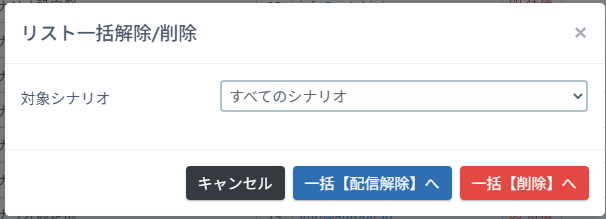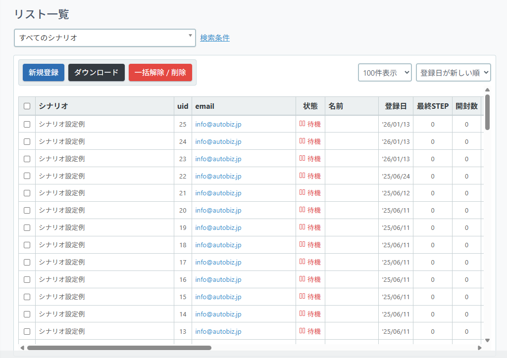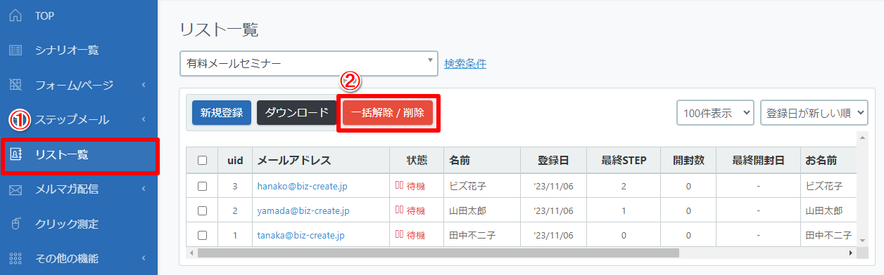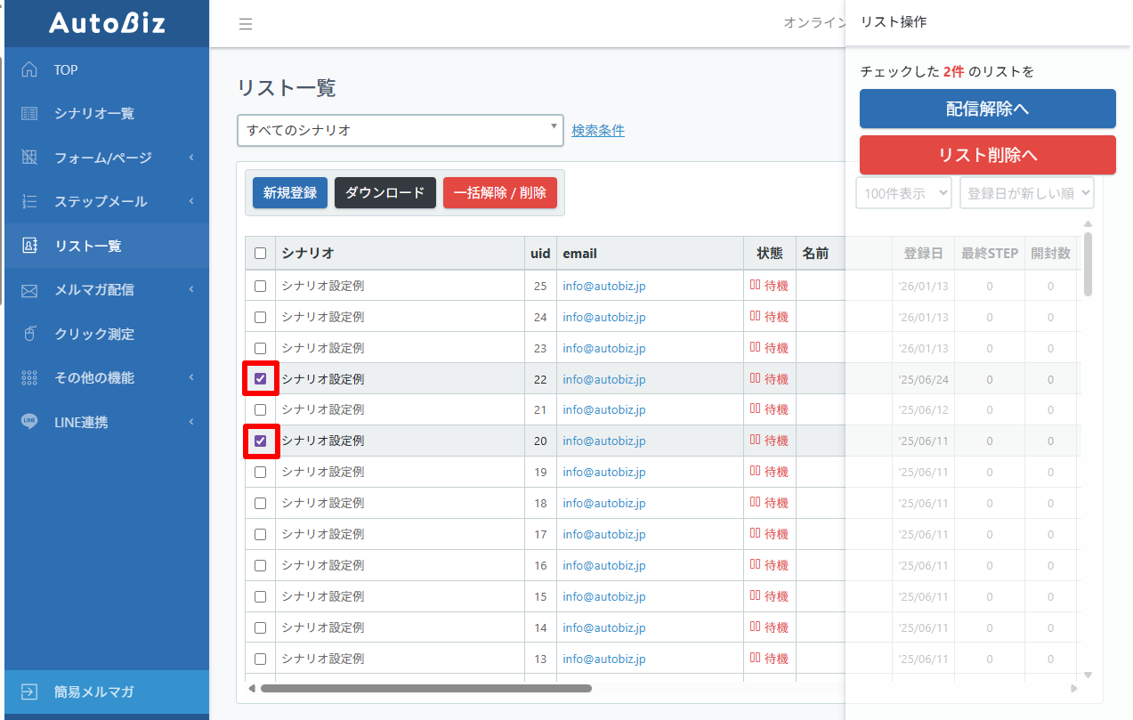 」が表示されます。チェックを入れたメールアドレスの解除、削除が行えます。(1ページごと)