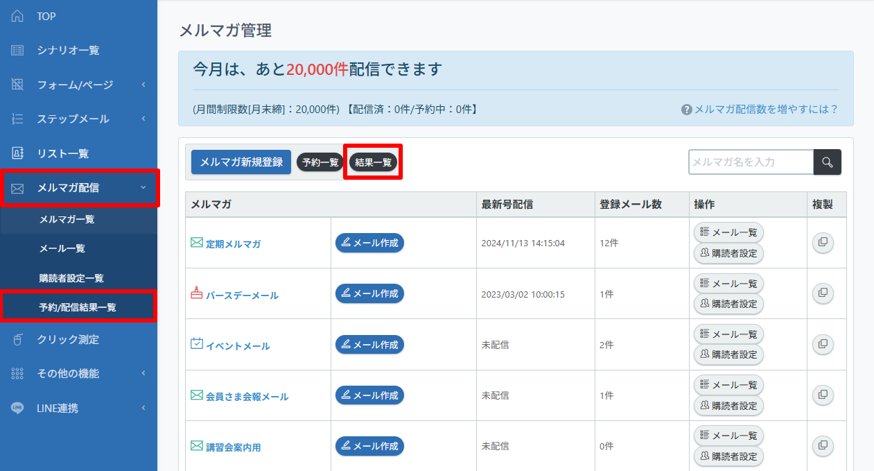 1.【メルマガ配信】>「予約/配信結果一覧」>「