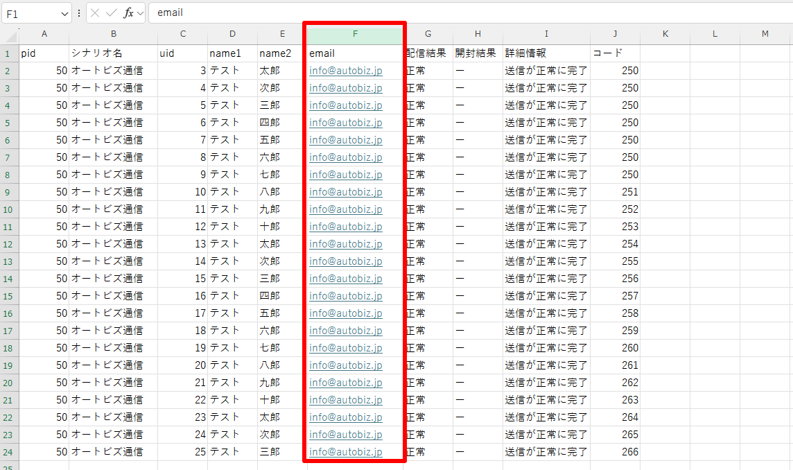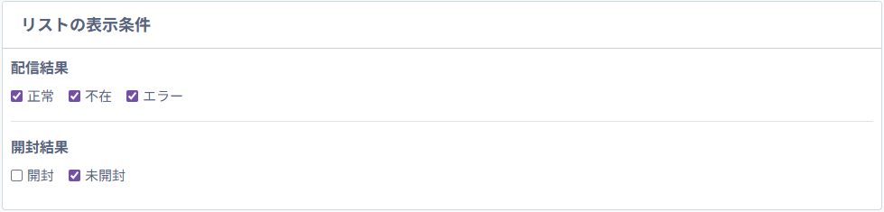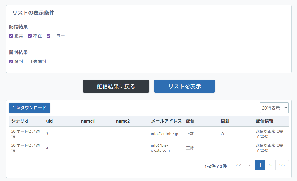 』ボタンをクリックするとチェックした表示条件のCSVファイルがダウンロードできます。 ※解除するには配信結果画面で未開封のメールアドレスリストをCSVファイルでダウンロードしておいてください。