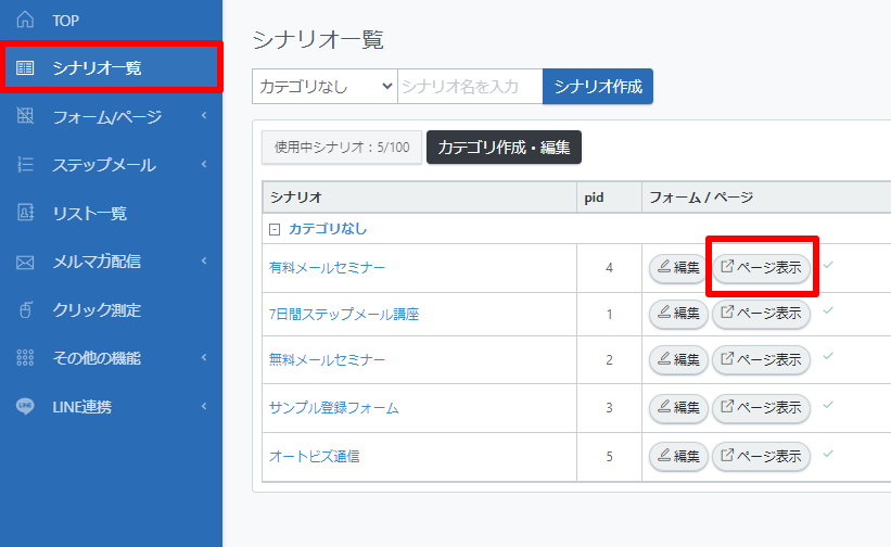 1.「シナリオ(スレッド)一覧」の【フォーム/ページ】列にある「ページ表示」ボタンをクリック