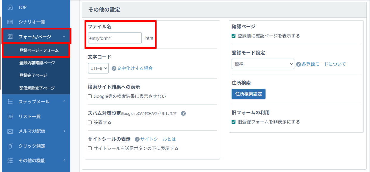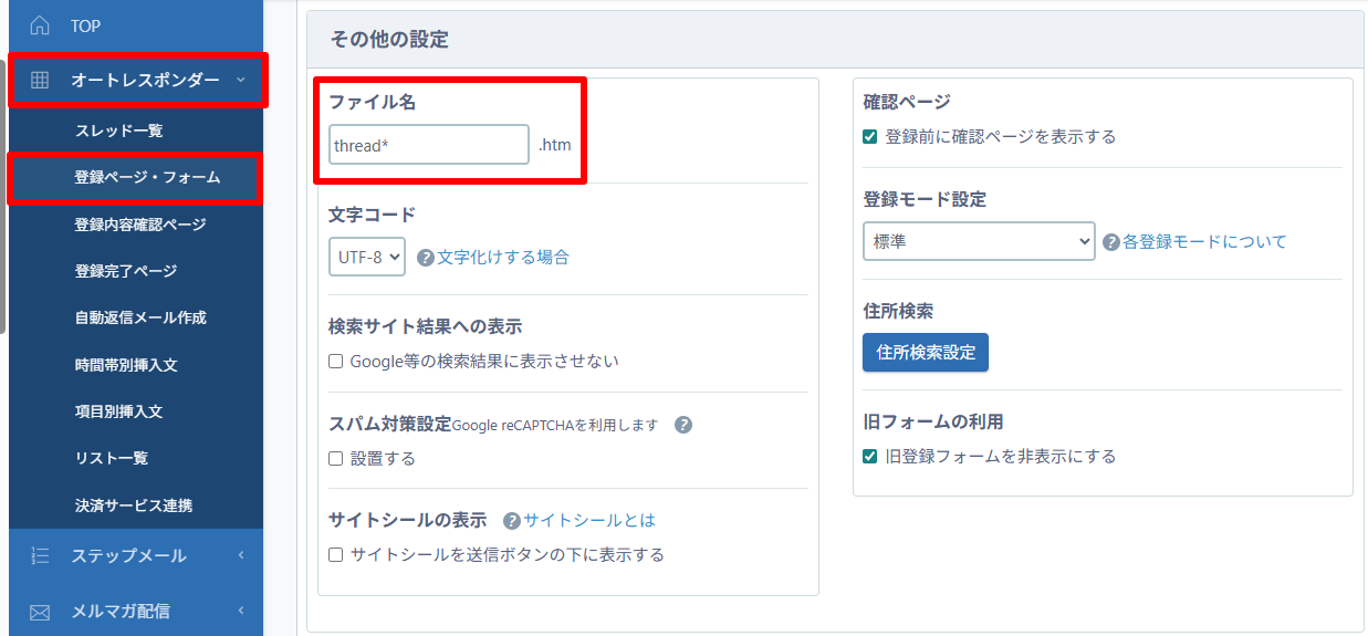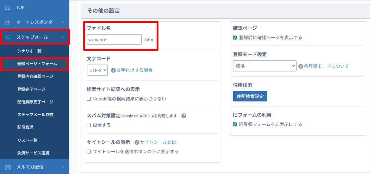 【フォーム/ページ】(【ステップメール】・【オートレスポンダー】)>「登録ページ・フォーム」画面の「ファイル名」から登録ページのファイル名を変更することができます。