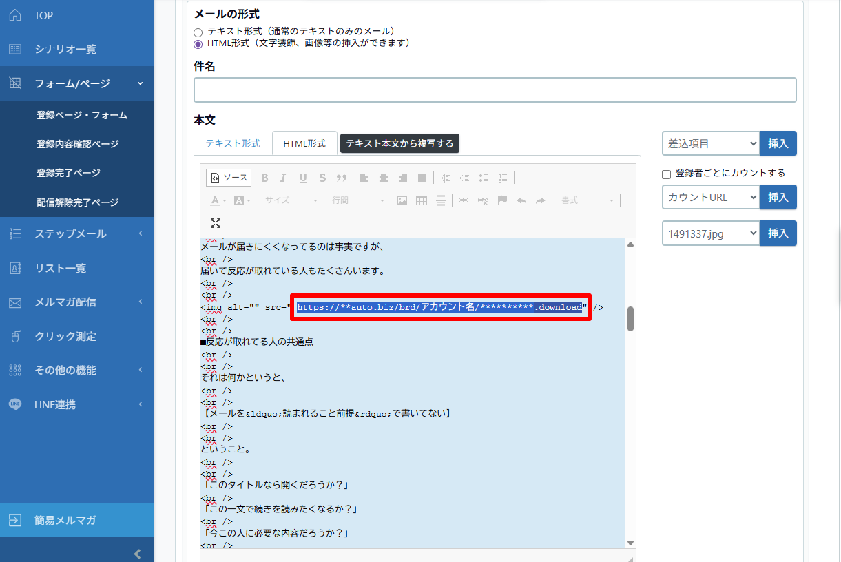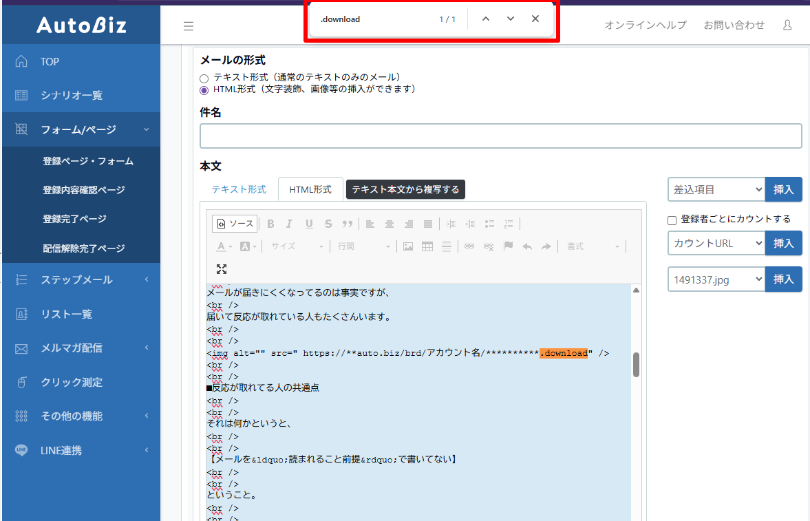 <img alt="" height="***" src="https://**auto.biz/brd/アカウント名/**********.download" width="***" /> ※キーボードで「Ctrl」+「F」を押して、あらわれた検索窓に「.download」を入力すると簡単に該当箇所を確認できます。