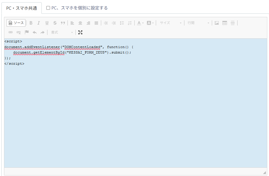 js<script> document.addEventListener("DOMContentLoaded", function() { document.getElementById("KESSAI_FORM_PAYPAL").submit(); });</script>※以下の画像のように「ソース」ボタンが凹んだ状態になっていることを確認してから貼り付けてください。