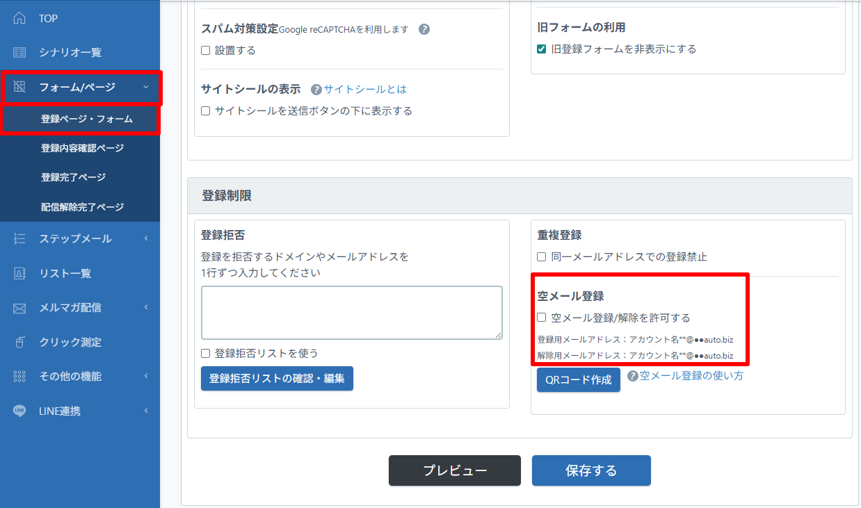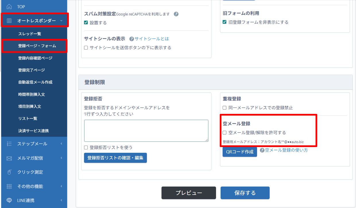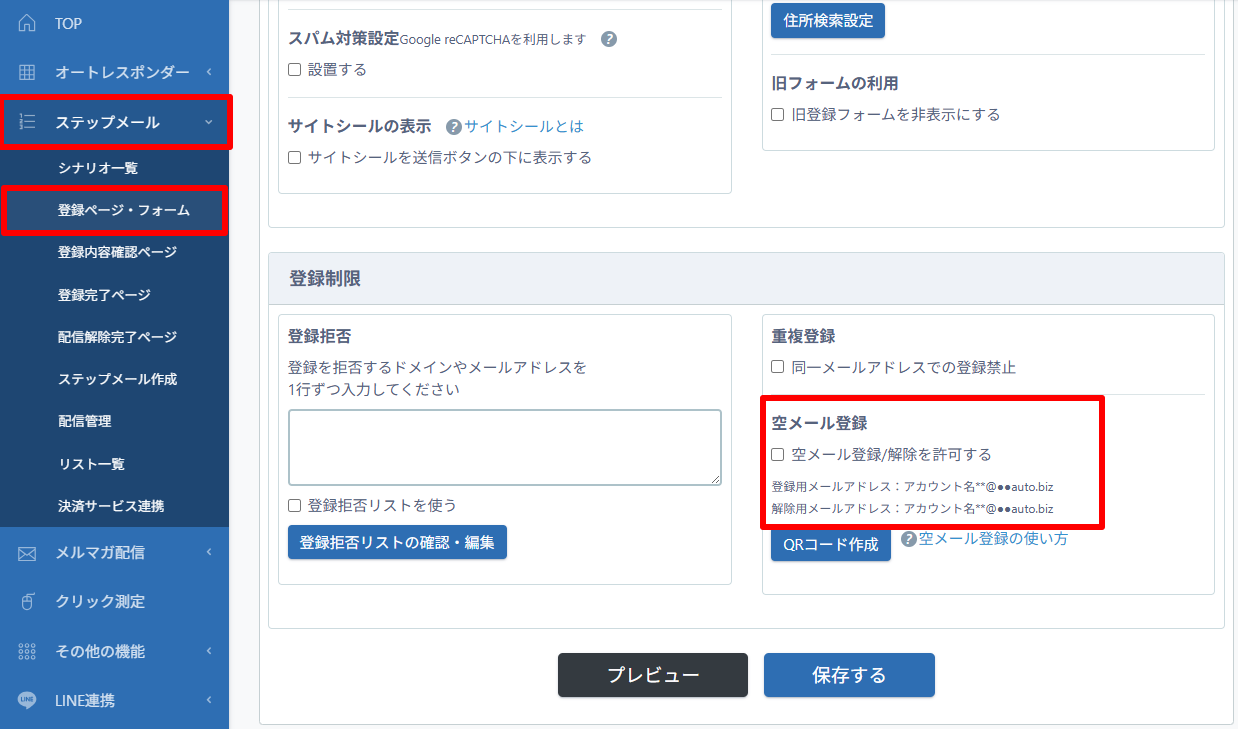 空メール登録用メールアドレス【フォーム/ページ】(【ステップメール】・【オートレスポンダー】)>「空メール登録」欄に記載されているアドレスを空メール登録用アドレスとしてご案内ください。 スーパーライト・ライト・スタンダードプロ(オートレスポンダー)プロ(ステップメール)アカウント名r*@●●auto.bizアカウント名e*@●●auto.bizアカウント名r*@●●auto.biz ※空のメールを送るだけでは登録は完了しません。 ※オートレスポンダーはメール配信機能が備わっていないため、解除用メールアドレスがありません。参考:空メール解除用メールアドレス