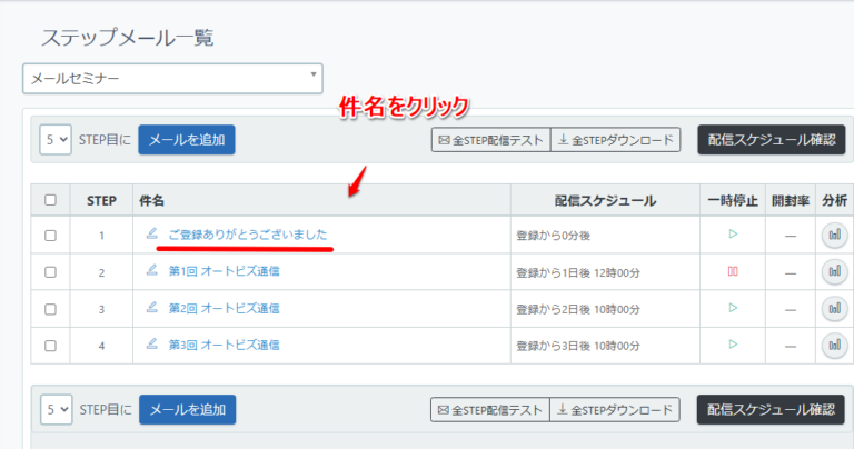1. テスト送信したいステップの件名をクリック
