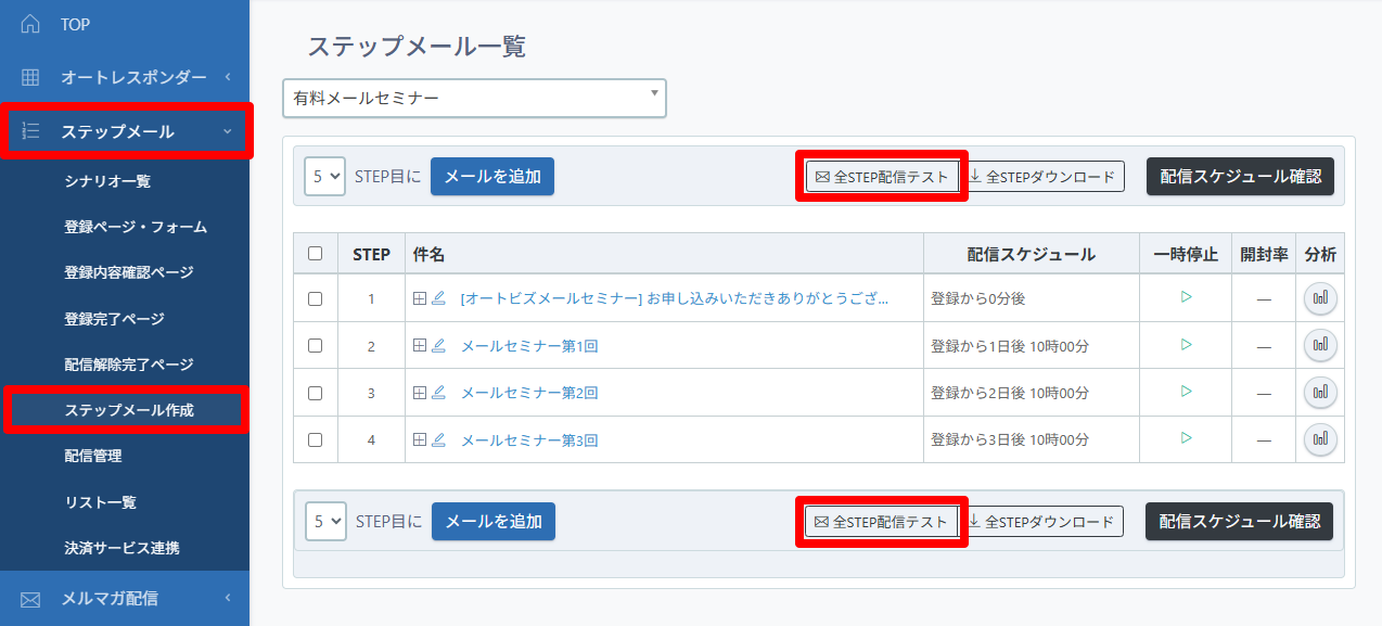 【ステップメール】>「ステップメール作成」で作成したステップメールを指定したアドレスにテスト送信することができます。