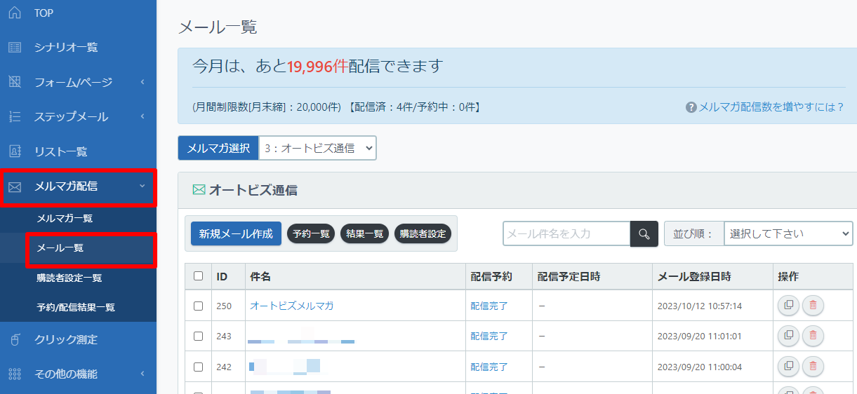 1.【メルマガ配信】>「メール一覧」>該当のメール件名をクリック