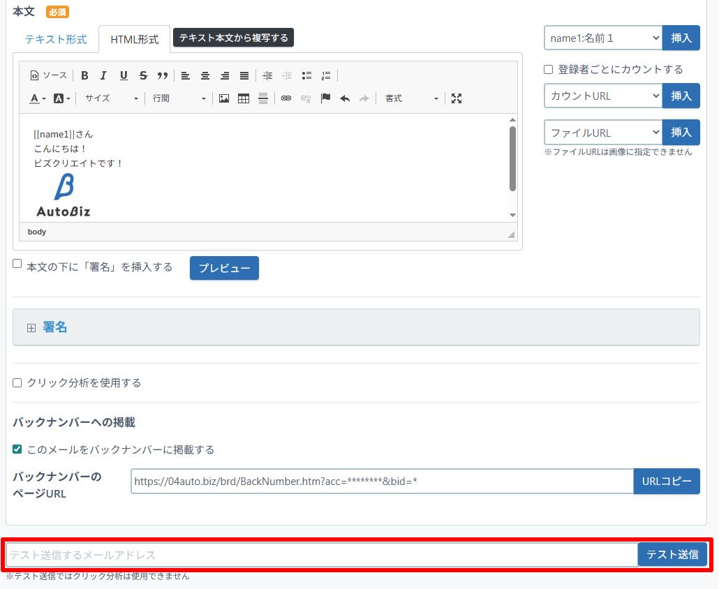 2.本文枠下の「テスト送信するメールアドレス」欄に宛先のアドレスを入力