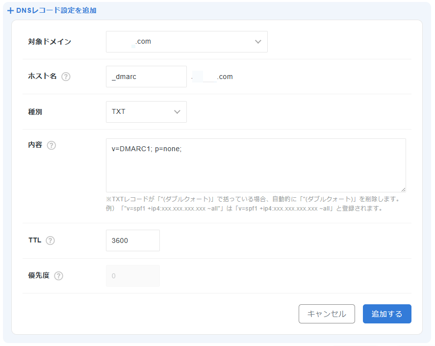 追加するDMARCのレコードホスト名:_dmarc種別:TXT内容:v=DMARC1; p=none;TTL:(そのままでOK)優先度:0DMARCの設定を行う専用のページで「何もしない」(none)を選択
