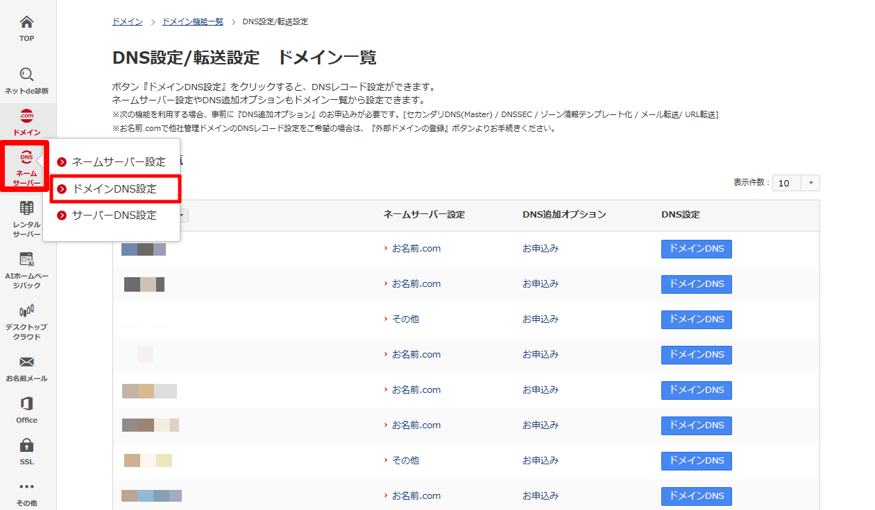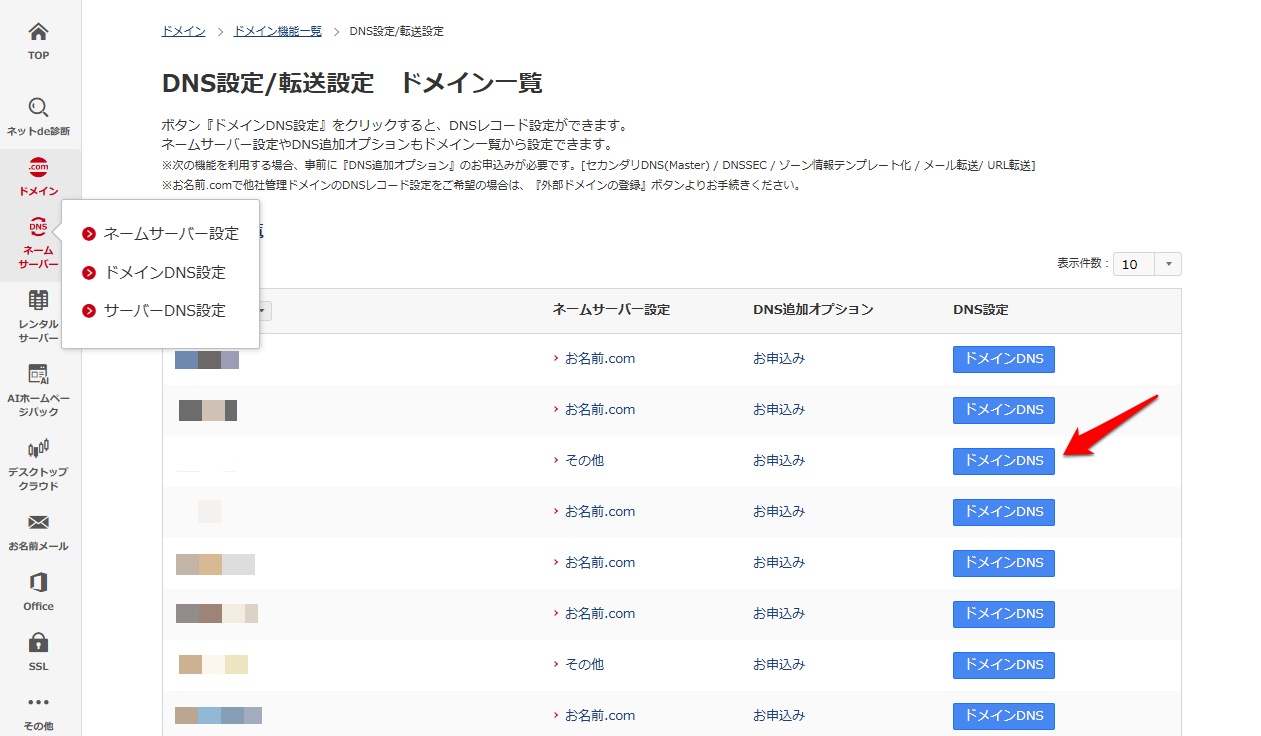 (3)該当のドメインの『ドメインDNS』をクリック