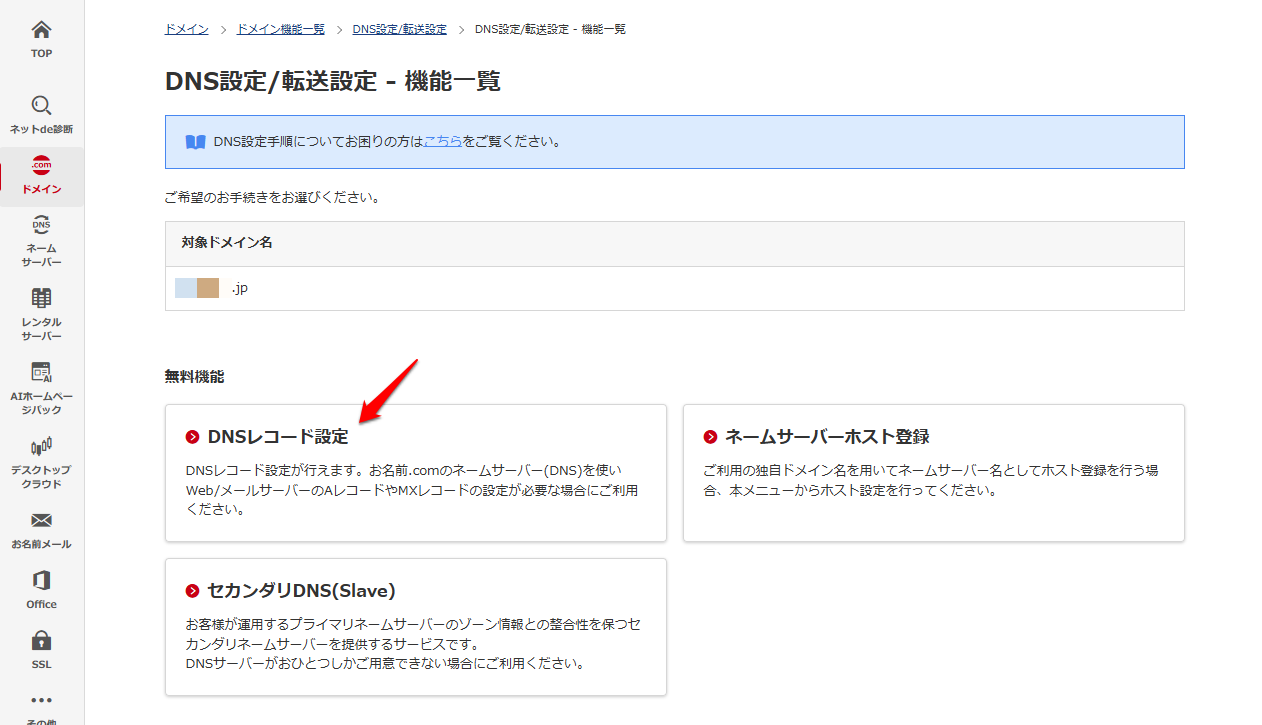 (2)左メニュー【ネームサーバー】から「ドメインDNS設定」をクリック